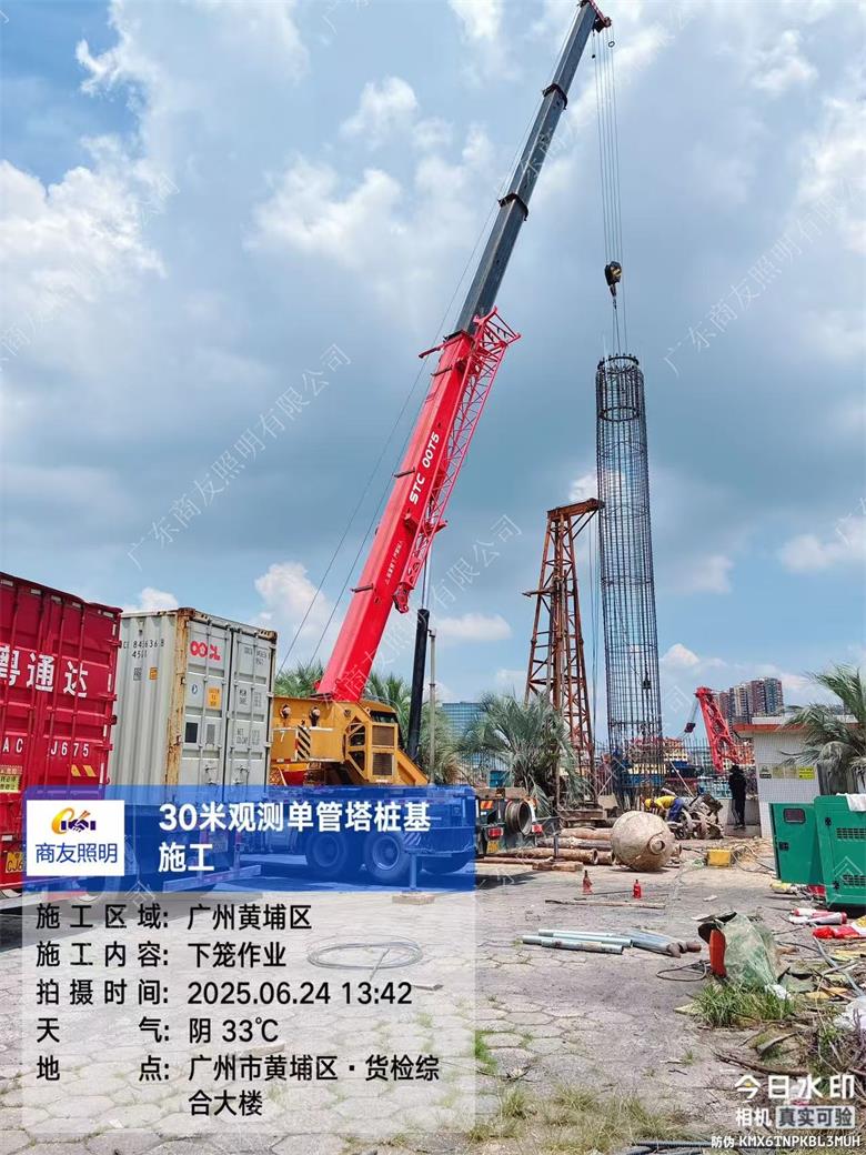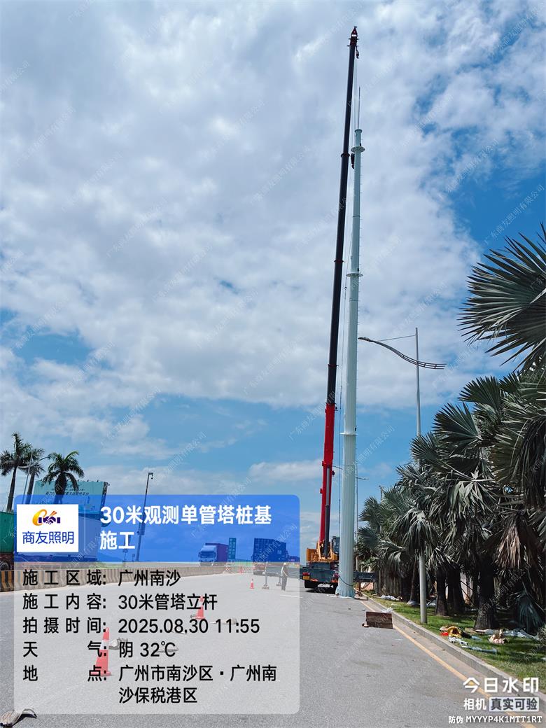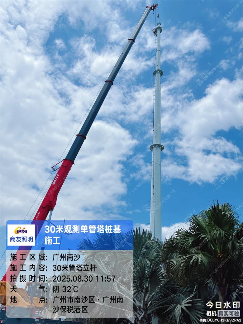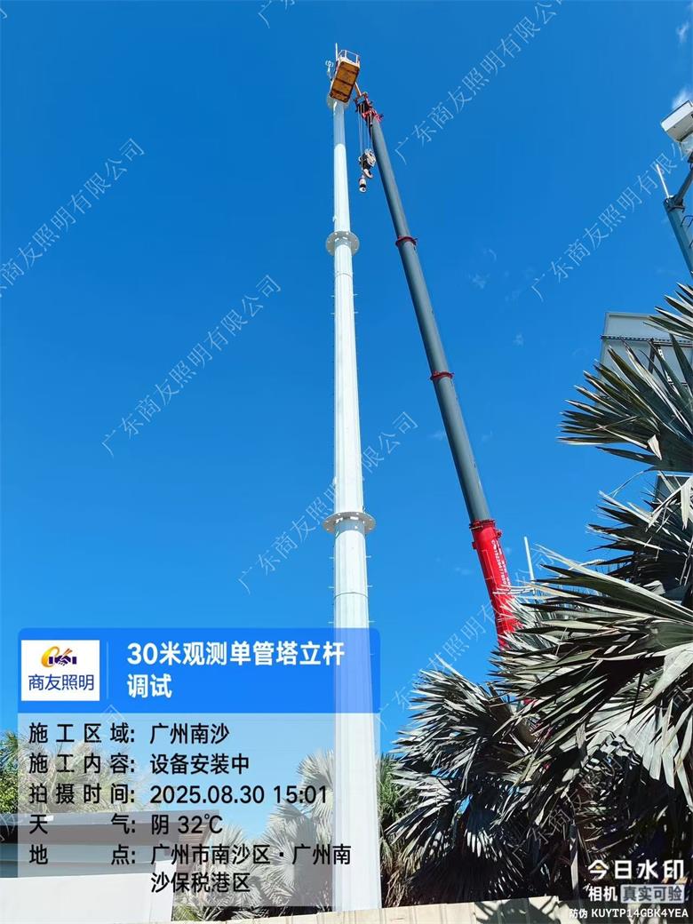 项目简述;环境环保检测设备塔主要用于大气、水质、土壤等环境要素的监测,常见类型包括大气监测塔、水质监测塔等。2025年6月广东商友照明公司30米环境监测设备塔助力广州港口工程,助力城市可持续发展。